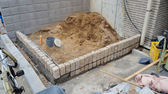 ・庭に敷いてある砂を撤去し、地面をランマとプレートで締固め。